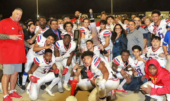 John Glenn High head coach Vince Lobendahn (far left) celebrates with his team following a 20-7 victory against Norwalk High last Friday in the annual Mayor’s Cup football game. The Eagles defeated the Lancers for the second straight season. PHOTO BY ARMANDO VARGAS, Contributing photographer
