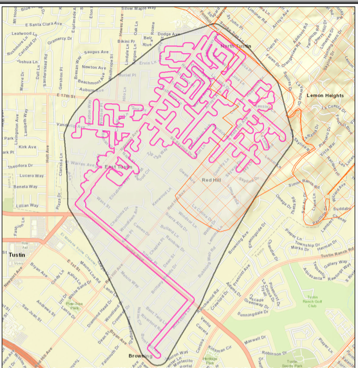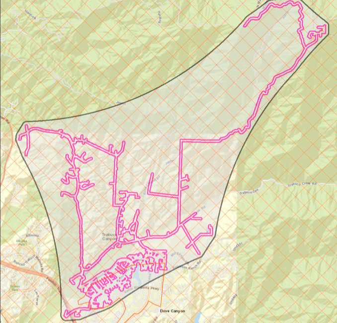Grey boundary indicates outage area; pink boundary is high fire risk area subject to shutoff. ORANGE RANCHO SANTA MARGARITA NORTH TUSTIN