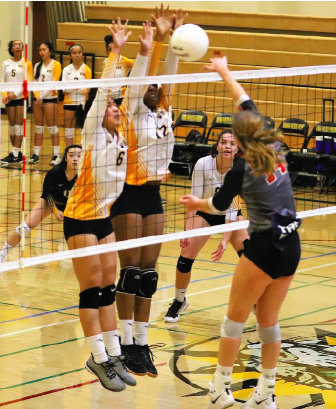 WHITNEY HIGH SENIOR opposite hitter Solyana Chan (#6) and senior middle blocker Ola Ogan attempt to block a shot from Caylie Barlage of Valley View High in last Saturday night’s CIF-Southern Section Division 6 girls volleyball second round match. Valley View swept the Lady Wildcats 25-17, 25-11, 25-12, ending Whitney’s season at 18-8. Photo by Armando Vargas, Contributing photographer