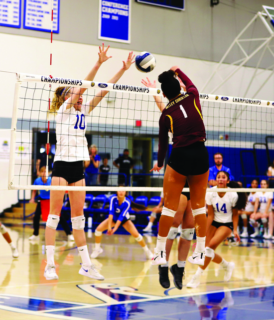 Valley Christian High junior middle blocker Rachel Gonzales goes for a kill against Norco High’s Taylor Underwood (#10) and an unidentified player in last Saturday CIF-Southern Section Division 4 championship match. The Lady Defenders upset the top-seeded Cougars 25-21, 14-25, 25-13, 25-21 to win the program’s fourth divisional title. Gonzales had 11 kills and 19 digs.