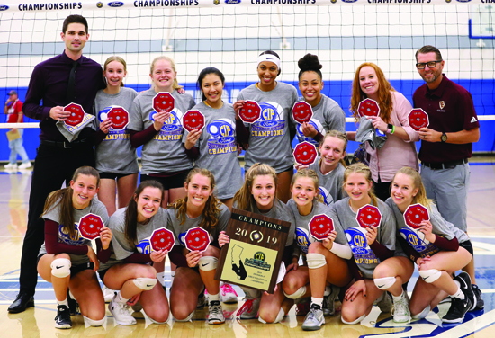 CHAMPIONS: The Valley Christian High girls volleyball team captured the CIF-Southern Section Division 4 championship last Saturday, upsetting top-seeded Norco High 25-21, 14-25, 25-13, 25-21. It is the program’s fourth divisional title and first since 1998. V.C. was led by junior outside hitter Ashlyn Couch (12 kills, 11 digs), junior outside hitter Rachel Gonzales (11 kills, 19 digs), senior middle blocker Megan Bouma (nine kills). junior middle blocker Dakota Quinlan (nine kills) and junior setter Rachel Lim (38 assists, 11 digs). PHOTO BY ARMANDO VARGAS, Contributing photographer