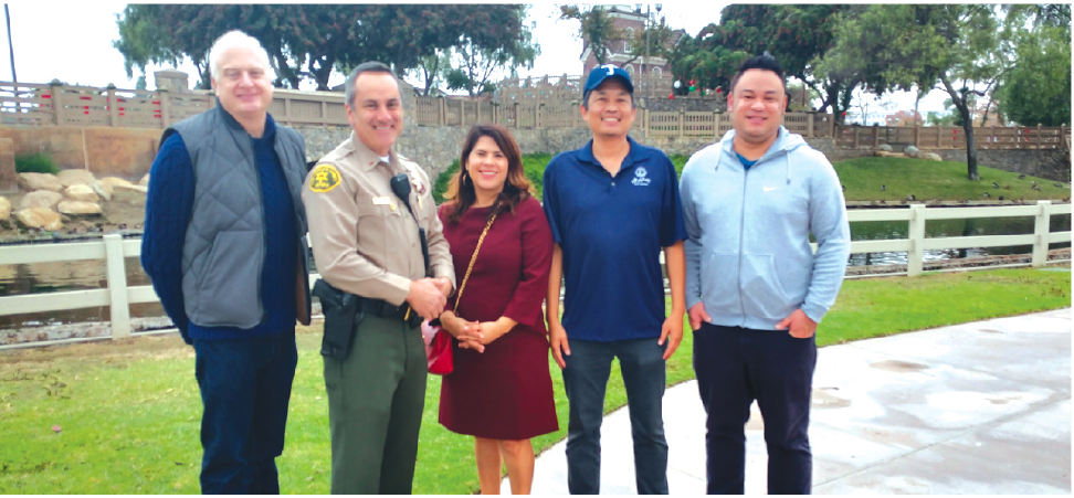 TOWN HALL: from (l-r) ABCUSD Communications Officer Scott Smith, Lieutenant Joseph Badali , ABCUSD Board President Dr. Olga Rios, Cerritos Mayor pro tem Frank Yokoyama, and resident Brian Ferrer at the Heritage Park walk wand talk meeting.