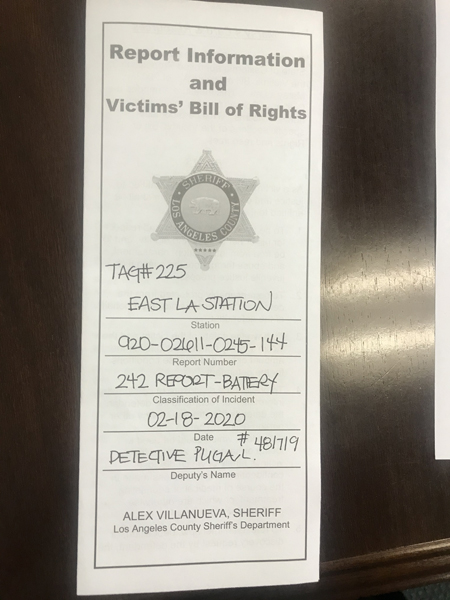Cover page of police report filed by Chair Vasquez today with the L.A. County Sheriff’s.