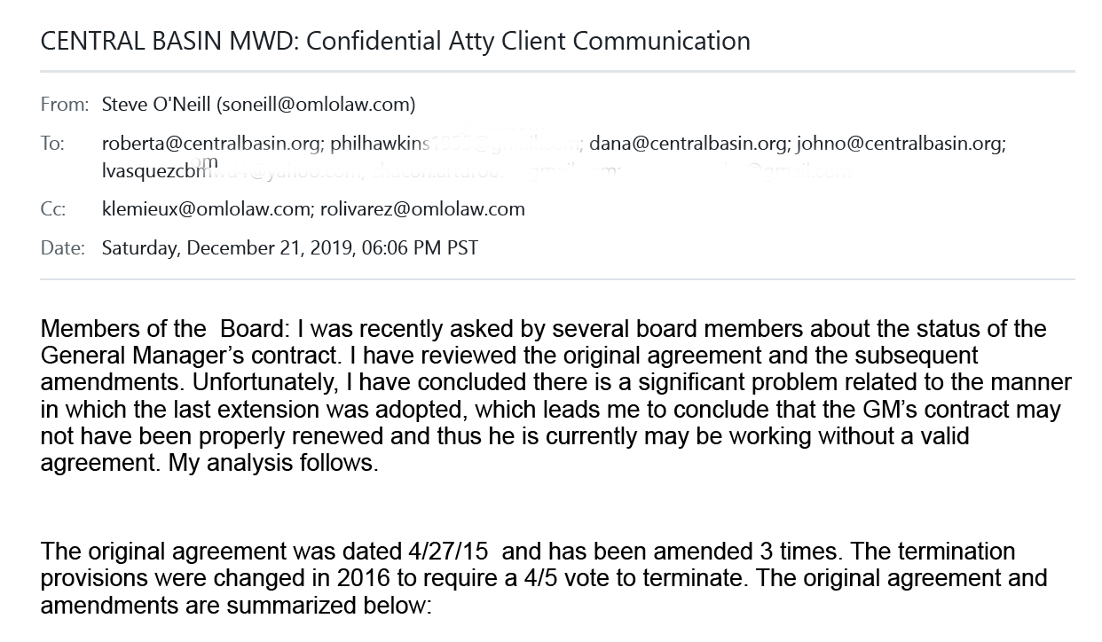 The letter started, “I urge you to take action against the Central Basin Water District Board of Directors, which has committed illegal acts and endangered the financial stability of the District. Against the advice of legal counsel, a group of four board members continued to have a meeting without a quorum and voted.”