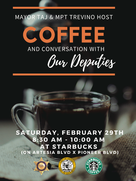 Artesia Mayor Ali Taj, along with Mayor pro tem Rene Trevino, will be hosting “Coffee and Conversation With Our Deputies” this Saturday from 8:30 AM to 10 AM at the Starbucks located at 11809 Artesia Blvd. in Artesia, near the corner of Artesia and Pioneer.