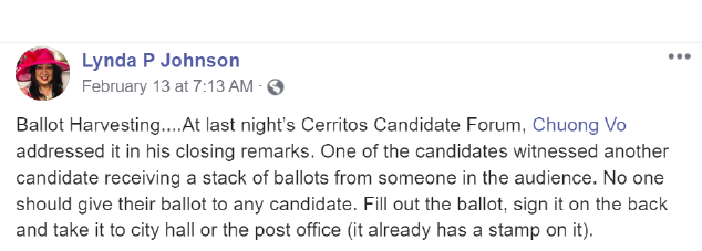 Cerritos resident and Supervisor Janice Hahn Field Representative Lynda Johnson has always held herself out as a Democrat, but it is evident, even though she works for a Hahn, she is working hard to get a conservative Republican elected to the Cerritos City Council, going so far as accusing another candidate in a Facebook post of election fraud.