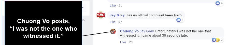 Johnson posted on Facebook and accused Jennifer Hong of ballot harvesting, candidate Chuong Vo followed the post and slammed the Hong, then later admitted he “did not witness the incident.”