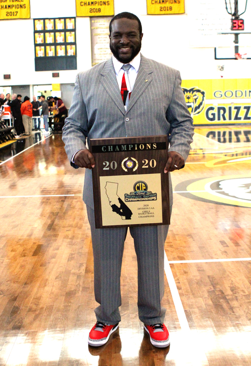ARTESIA HIGH girls basketball head coach Shontya Pouncey is all smiles as he holds the plaque following his team’s 46-38 victory over San Jacinto Valley Academy in the CIF-Southern Section Division 5 AA championship game last Saturday at Godinez High. It was Artesia’s first divisional championship since 2003. The Lady Pioneers finished this season at 26-8, the program’s first winning campaign since the 2006-2007 season. PHOTO BY ARMANDO VARGAS, Contributing photographer.