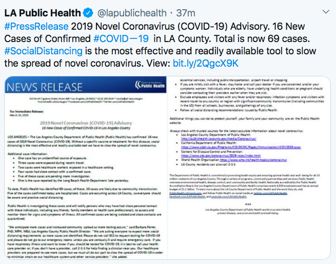 The Los Angeles County Department of Public Health tweeted out 1/2 hour ago that 16 new cases were confirmed in the county.