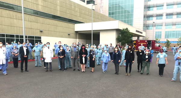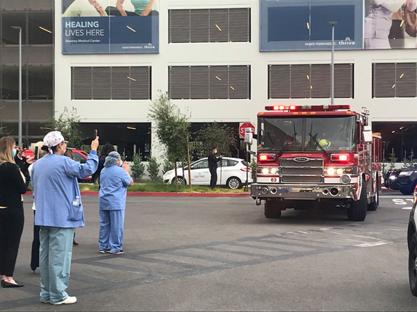 Frontline workers at Kaiser Permanente Medical Center in Downey watch as police and fire honor them for their services during the pandemic. Courtesy Downey Chamber of Commerce.