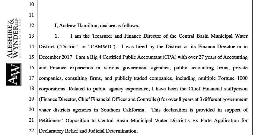 The declaration was found in the lawsuit several cities filed against Central Basin related to the appointments of Leticia Vasquez and Art Chacon as Board Officers.