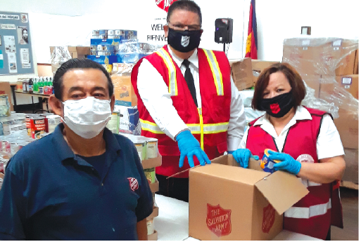 PACKING: (l-r) Juan Rodriguez with Salvation Army Bellflower Corps Envoys Manuel Martinez, and his wife, Belsy, as they prepare monthly food distribution boxes for families, seniors and the disabled. A safe, drive-thru pick up of boxes is offered by appointment those from any city during the COVID-19 crisis
