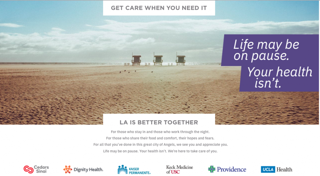 Cedars-Sinai, Dignity Health, Providence, UCLA Health, Keck Medicine of USC and Kaiser Permanente, have launched public service announcements called BetterTogether.Health with themes that include “Life may be on pause. Your health isn’t.,” “Thanks L.A. for doing your part.,” and “Get care when you need it.”