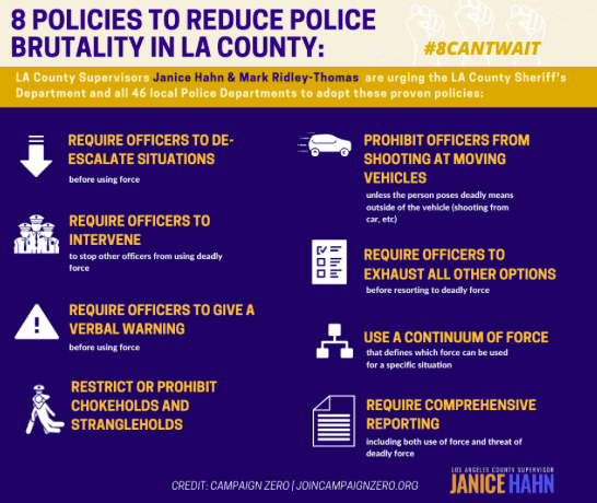 Los Angeles, CA—Los Angeles County Supervisors Janice Hahn and Mark Ridley-Thomas want the Los Angeles County Sheriff’s Department and the county’s 46 local police departments to update their Use of Force policies to include eight policies proven to reduce the number of people killed by police. These eight policies have been put forward by Campaign Zero, an advocacy group led by DeRay Mckesson, Samuel Sinyangwe, and Brittany N. Packnett Cunningham which has published vital research on police practices and is developing data-driven policies to end police brutality.