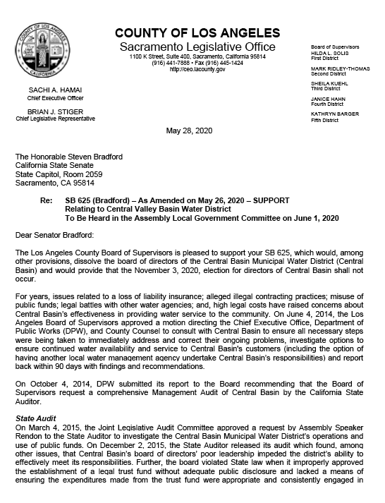 The hearing debated Sen. Steven Bradford and Asm. Cristina Garcia’s SB 625, which would place Commerce-based Central Basin Water into receivership, dissolve the board of directors and cancel its November 2020 election, disenfranchising over 2 million mostly minority voters in 24 cities in Los Angeles County.