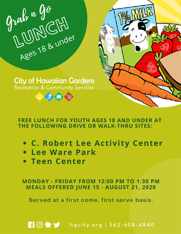The City of Hawaiian Gardens will be serving Grab – N- Go lunches at the following locations starting June 15 to Aug 21. The lunches will be served Monday thru Friday from 12:00pm to 1:30pm served on a first come, first served basis.