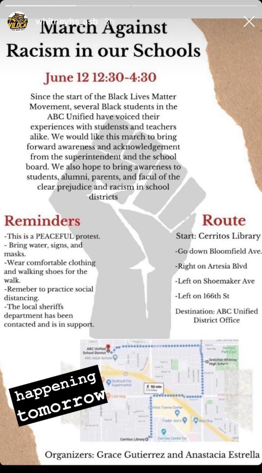 The march will occur from 12:30-4:30 starting at Cerritos Civic Center/Library working its way down Bloomfield, Artesia, Shoemaker, 166, ending at the ABC District offices.