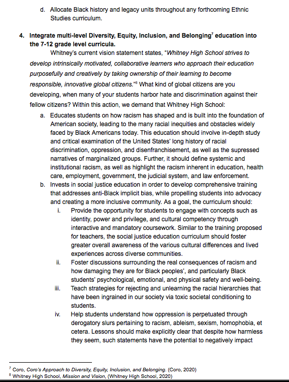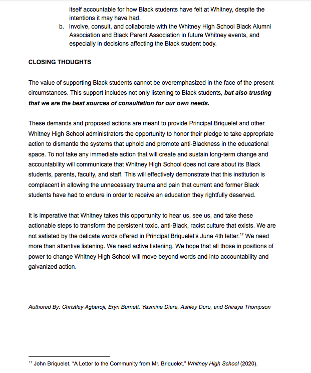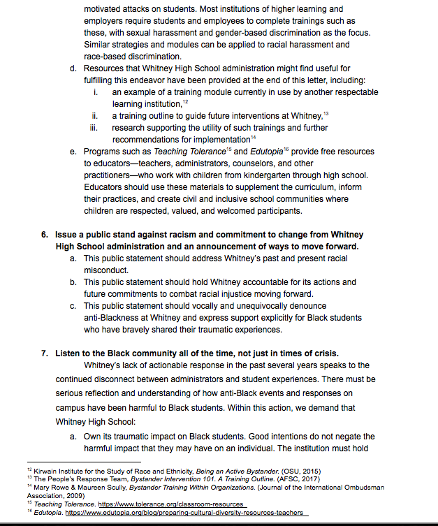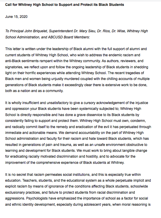 “Issue a public stand and statement against racism and a commitment to change from Whitney High School administration. The statement should address Whitney’s past and present racial misconduct and hold Whitney accountable for its actions and [outline] future commitments to combat racial injustice. The statement should vocally and unequivocally denounce anti-Blackness at Whitney and express support explicitly for Black students who have bravely shared their traumatic experience.”