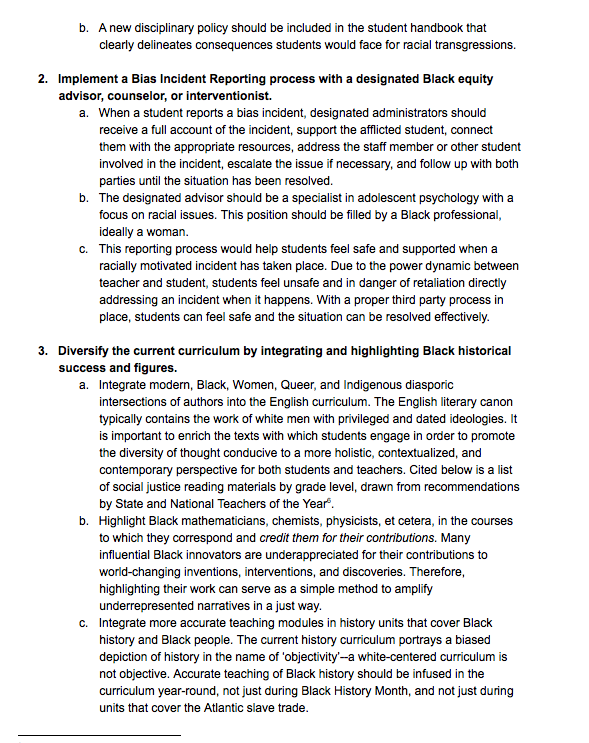 One point demanded that Whitney issue a statement on racism at the school.
