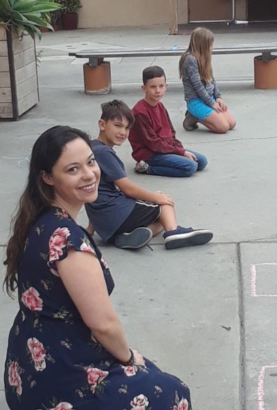In the foreground is Youth Center Program Director and Camp SHARK Director Jamie Harris with children playing “Duck Duck Goose” at St. Isidore Historical Plaza in Los Alamitos. The Youth Center has offered free childcare for essential workers at the since June 1 at the plaza. Photo by Laurie Hanson.