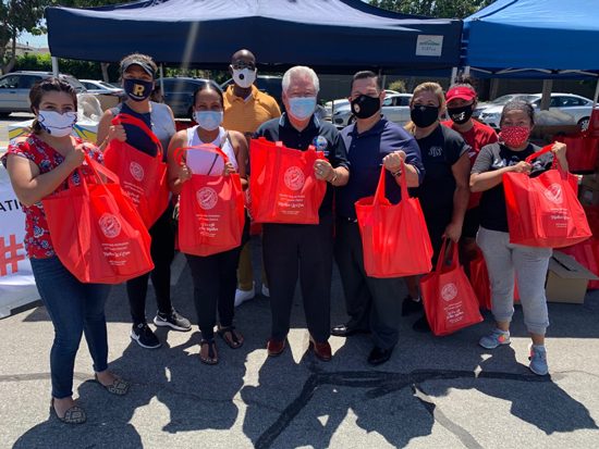 More than 350 families participated in a food distribution program sponsored by Senator Bob Archuleta (center) , City of Refuge Ministry and the city of Montebello. He was joined by Montebello Mayor Salvador Melendez, Councilmembers Angie Jimenez, David Torres and Jack Hadijian, members of the Montebello police and fire departments, Pico Rivera Councilwoman Monica Sanchez, and MUSD Personnel Commissioner Fernando Chacon and 40 volunteers unloaded trucks of food and distributed bags and boxes of food to people in need during this pandemic crisis as they lined up in their cars at Montebello City Hall.