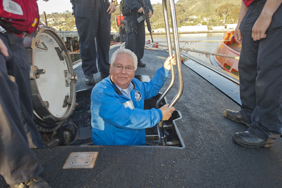 State Senator Bob Archuleta (D-Norwalk) going “down the hatch” of the USS Pasadena.
