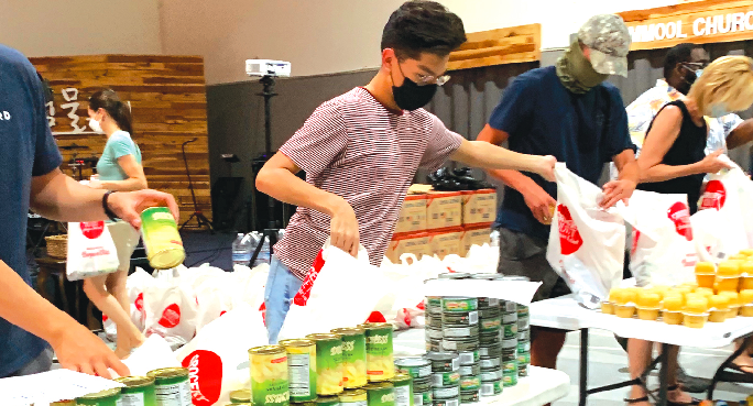 HELPING OUT: 15 year old La Mirada resident Joseph Juarez fills care packages.
