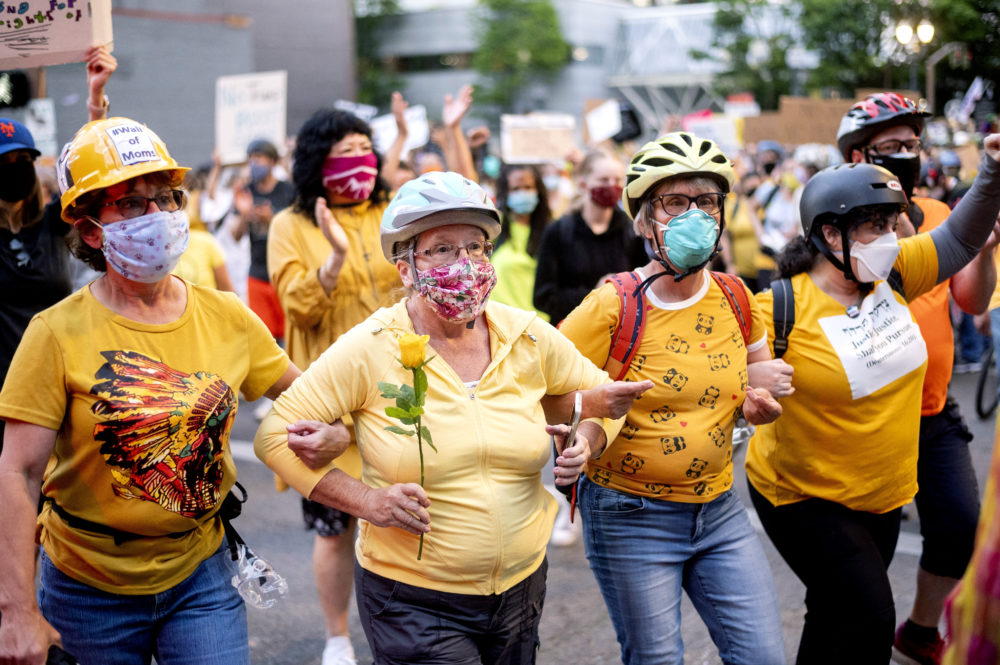 The Wall of Moms started as a small group of mothers, many dressed in yellow, shielding protesters from federal agents in Portland, but quickly became a much larger presence at demonstrations and has also since spread to other cities.