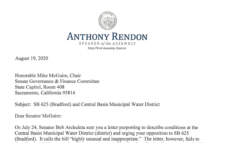 In a questionable last ditch effort to pass SB 625, the bill that would have put Central Basin Municipal Water into receivership, disenfranchised over 2 million voters, and retained a management base of disgruntled employees who were illegally fighting for the bill to pass, Assembly Speaker Anthony Rendon disrespected California Senate President pro tempore Tony Atkins by going around Atkins and sending a letter to Senate Governance and Finance Chair Mike McGuire urging him to move the bill for concurrence.