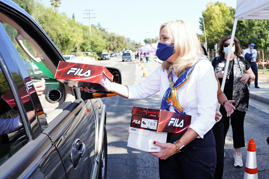 Observing the requirements to wear masks and social distancing guidelines, participating families remained safely in their vehicles while DPSS Toy Loan staff placed the backpacks in their trunks. All backpacks and supplies were donated by County of L.A. employees, L.A. Public Library, private and corporate donors, and through a partnership with Amazon, which allowed online donations by visiting the Toy Loan Program’s Amazon Smile wish list. Trader Joe’s and Grocery Outlet Altadena were on site providing snacks to families as was Shoes That Fit, which donated shoes to every child in attendance.