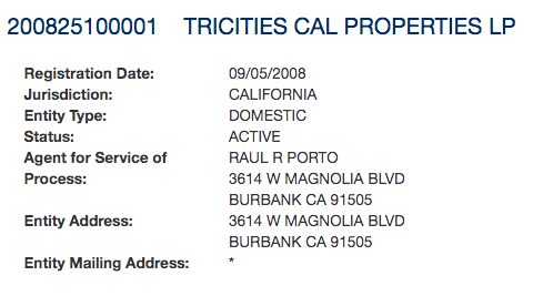 Screenshot from Secretary of State’s website showing owner Raul Porto of Tricities Cal Properties, LP.