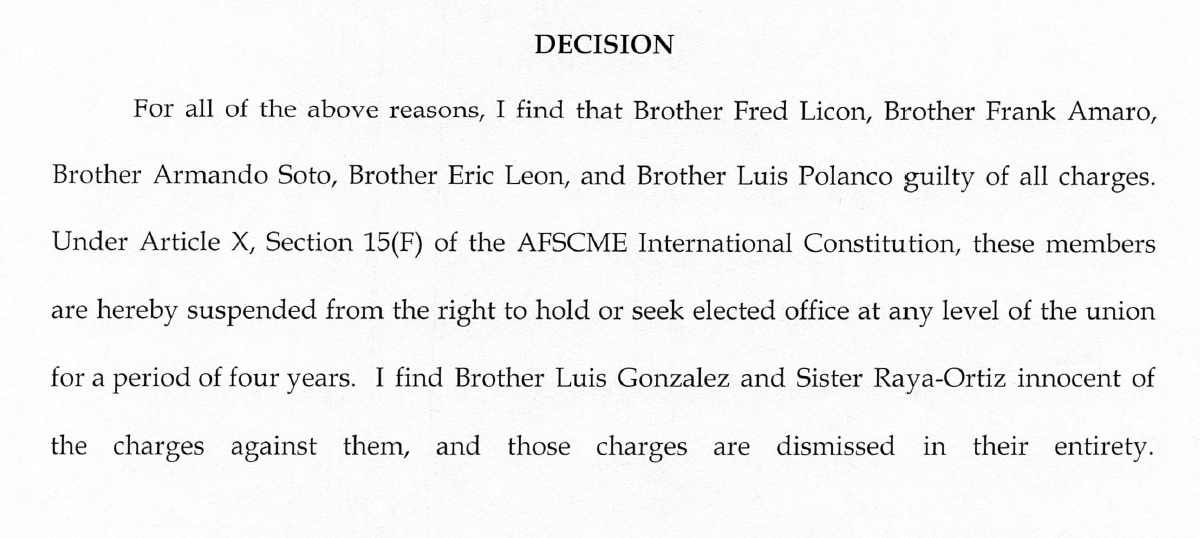 Demarco concluded that the Licon, Amaro, Soto, Lyons, and Polanco were guilty of all charges and suspended them from the right to hold elected office at any level of the union for a period of four years.
