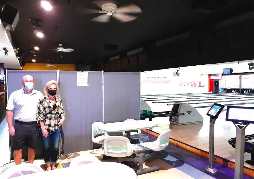 JASON AND JODI ALTMAN standing in the Gage Bowling Center. The Center has been a thriving business for 60 years, but may be forced to close their doors because they have not been allowed to reopen.