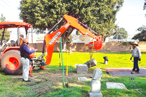 FIXING FINANCES AND HEADSTONES: Cemetery GM Tony Mendoza (left) directing the placement of a headstone at the cemetery. Mendoza and the new board are directing many changes at the grounds and plan to hold touring events soon.