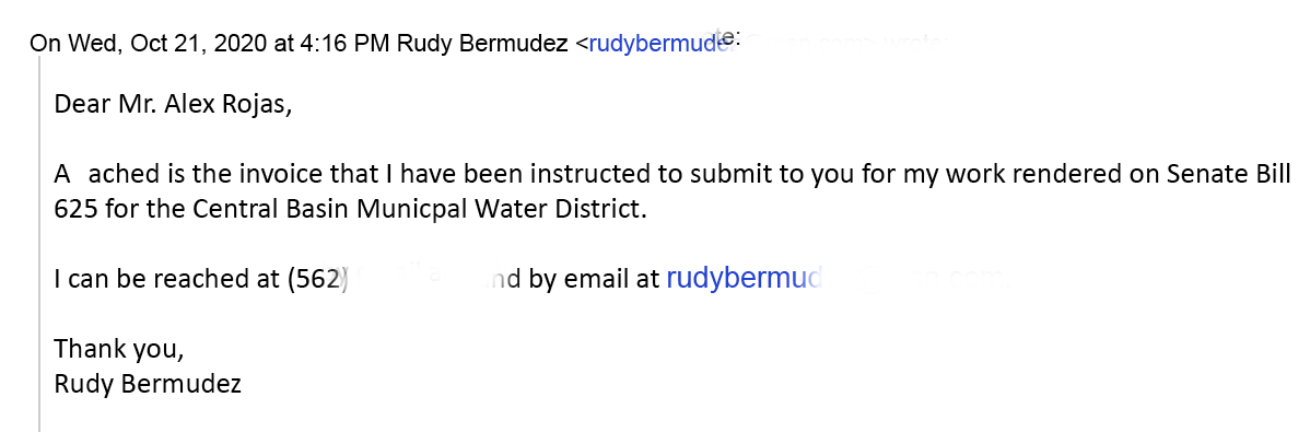 Bermudez wrote Rojas, “Attached is the invoice that I have been instructed to submit to you for my work rendered on Senate Bill 625 for the Central Basin Municpal [sic] Water District.”