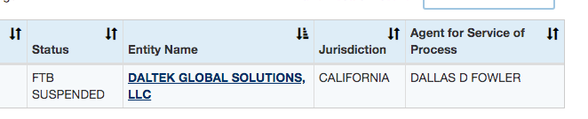 In another troubling sign, a check on the California Secretary of State’s website shows Daltek is suspended by California’s Franchise Tax Board and has not filed the required Statement of Information since 2017.