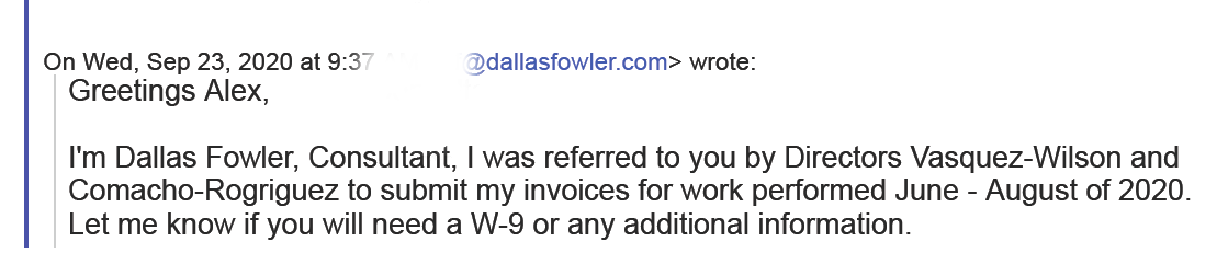 In an email to Rojas Fowler wrote, “I’m Dallas Fowler, I was referred to you by Directors Vasquez-Wilson and Camacho-Rodriguez to submit my invoices for work performed.”