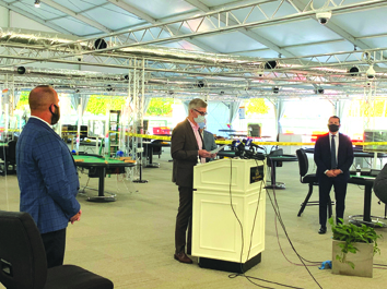 GARDENS CASINO General Counsel Keith Sharp speaks at a news conference this week to voice concerns over the closures mandated by the L.A. County Health Department. The closures will force thousands of layoffs and hit cities, such as Hawaiian Gardens, with a major loss of revenue.