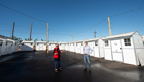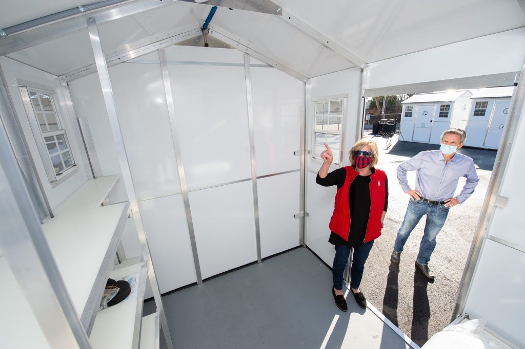 TINY BUT MIGHTY: Fourth District L.A. County Supervisor Janice Hahn with Redondo Beach Mayor Bill Brand surveying pallet houses for the homeless. The houses are 8 x 8 foot and can accommodate one or two people inside, with drop down beds, power outlets, heaters, and personal locked storage areas.