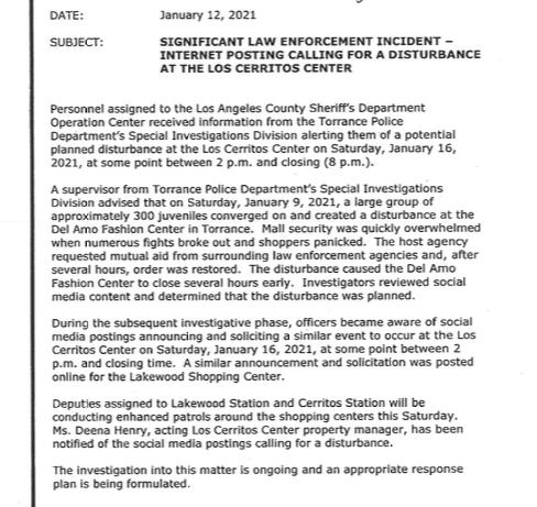 Hews Media Group-Cerritos News has received a memo from the Torrance Police Department’s Special Investigations Division to the Los Angeles County Sheriff’s Department Operation Center alerting them of a potential large planned disturbance at the Los Cerritos Center this Saturday, January 16, at some point between 2 p.m. and closing, which is 8 p.m.