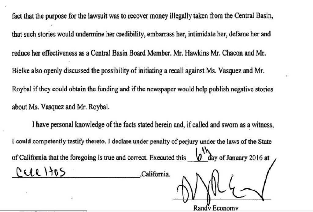 Economy’s signed sworn affidavit dictated under penalty of perjury. The 21-page document contained numerous false and defamatory statements against HMG-CN, Central Basin Directors Art Chacon and Phil Hawkins, and Ron Bielke.