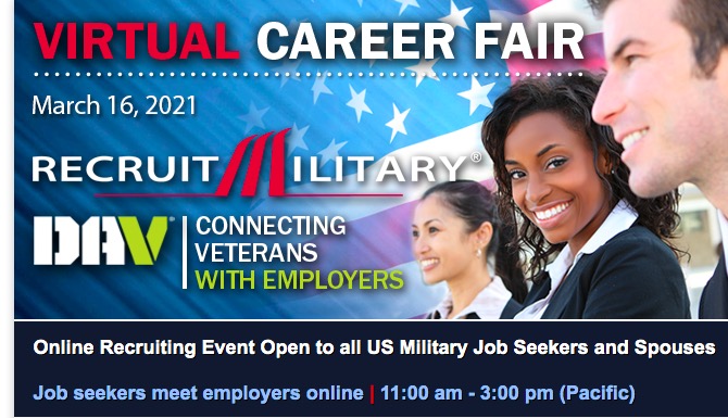 RecruitMilitary and DAV will host the Western Region Virtual Career Fair for Veterans & Military Spouses tomorrow, Tuesday, March 16th from 11am to 3pm Pacific Time. This virtual hiring event is open for registration to all transitioning members of the military, veterans, military spouses and dependents. RecruitMilitary’s virtual events are technologically enhanced to provide personal interaction among job candidates and employers in large group, small group and one-one-one formats. To view a tour of the virtual event format, visit here.