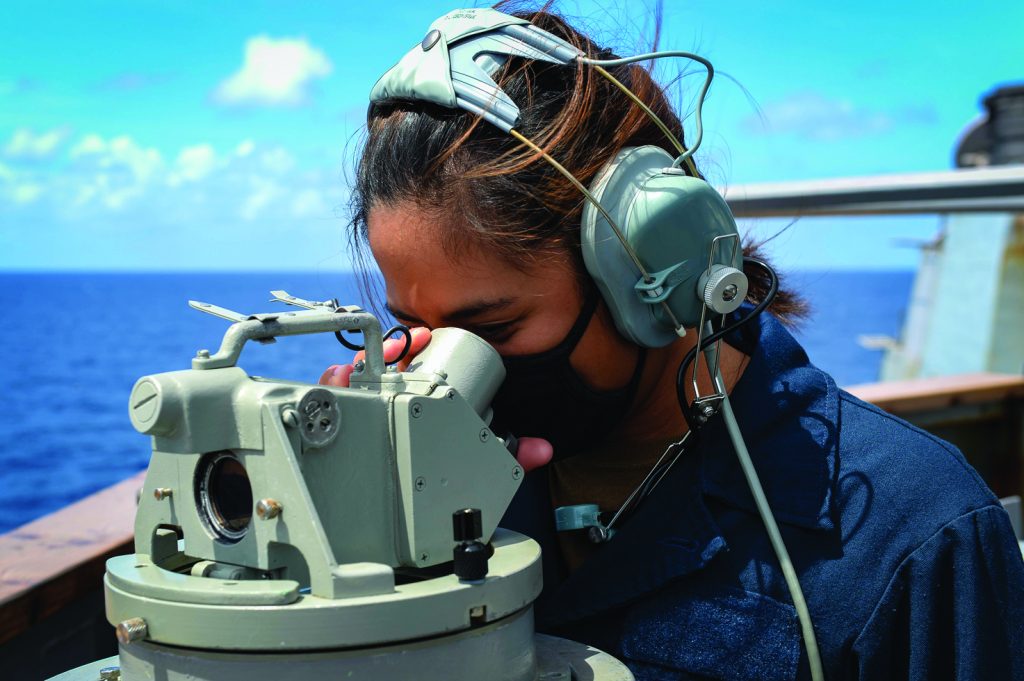 U.S. NAVY Seaman Anjuli WeeEng, from Long Beach, Calif., uses an alidade on a bridge wing of the Arleigh Burke-class guided-missile destroyer USS Russell (DDG 59) March 7, 2021. Russell, part of the Theodore Roosevelt Carrier Strike Group, is on a scheduled deployment to the U.S. 7th Fleet area of operations. As the U.S. Navy’s largest forward-deployed fleet, 7th Fleet routinely operates and interacts with 35 maritime nations while conducting missions to preserve and protect a free and open Indo-Pacific. (Photo by Mass Communication Specialist 3rd Class Wade Costin)