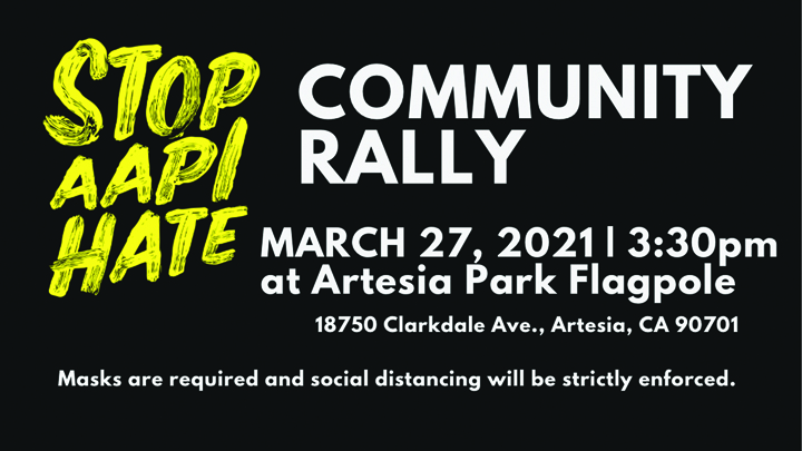 Community leaders will hold a stop AAPI Hate Rally at Artesia Park this coming Saturday, March 27. at 3:30 pm. The park is located at 18750 Clarkdale Avenue., Artesia, California, 90701.