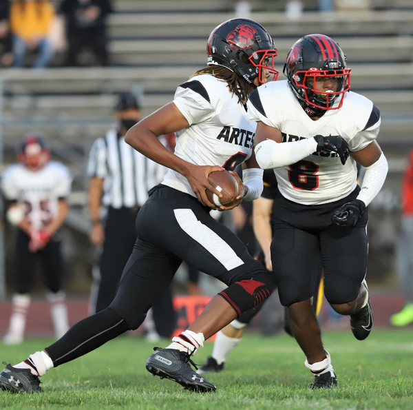 Artesia High junior quarterback K’Len Williams (left) fakes a handoff to senior running back Jelani Hopkins in last Friday night’s 605 League contest against host Cerritos High. Williams rushed for 55 yards on 16 carries and also threw for 37 yards in a 30-6 loss. Hopkins would pick up 54 yards on 15 carries. PHOTO BY ARMANDO VARGAS, Contributing photographer.