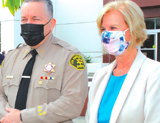 CLINIC: L.A. County Sheriff Alex Villanueva and L.A. County Supervisor Janice Hahn at a recent vaccine clinic held at the Cerritos Civic Center in April.