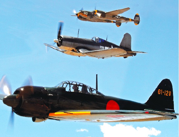 THE MUSEUM’S Mitsubishi A6M5 “Zero” (bottom) flies in formation with their F4U “Corsair” and P-38 “Lightning” (top). These aircraft fly regularly at the Museum at special Living History events and at the Museum’s annual Airshow.
