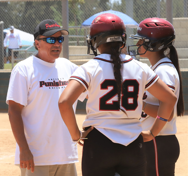 Artesia Punishers 18 Gold travel softball head coach Bob Medina, shown talking to a pair of his players at the 2019 Premier Girls Fastpitch National Championships, was recently hired to be an assistant coach for Chaminade University in Honolulu, Hawai’i. Medina has previously coached at two other colleges in Southern California and a pair of local high schools. FILE PHOTO BY ARMANDO VARGAS, Contributing photographer.
