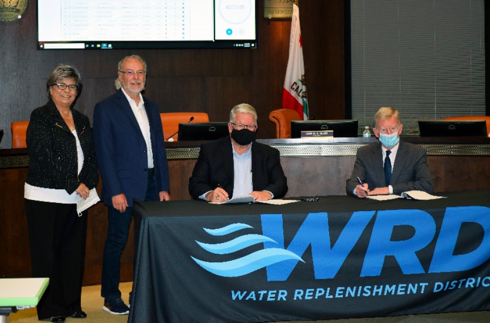 Project Labor Agreement Signing from (l-r) WRD Board Member Vera Robles DeWitt, WRD Board Member Rob Katherman, LA/OC Building Trades Council Executive Secretary Ron Miller, WRD Board President John Allen.
