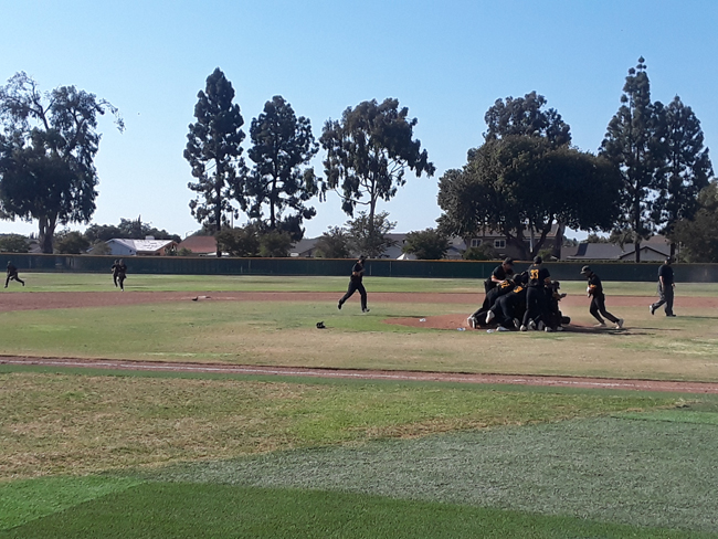 Members of the Cerritos High baseball team converge on the pitching mound following the final out of its 3-2 win against Oxford Academy last Thursday. The Dons (18-4 overall) won all 10 of their 605 League games to repeat as league champions. PHOTO BY LOREN KOPFF.